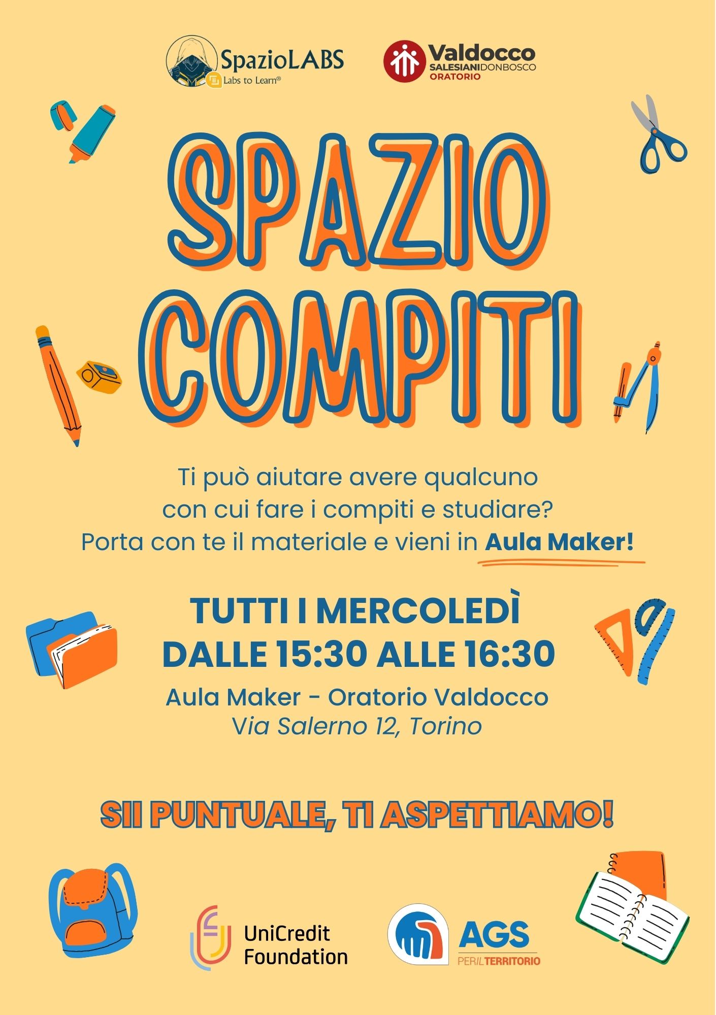 Lo Spazio Aggregativo dell’Oratorio Valdocco, inserito all’interno del progetto Spazio LABS, è un ambiente accogliente dedicato a ragazze e ragazzi delle scuole superiori, pensato per offrire supporto nello studio e opportunità di crescita personale e relazionale.